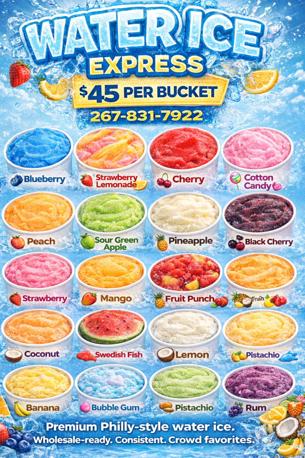 We provide an extensive selection of over 20 flavors of water ice, with prices that vary according to the flavor and quantity. In addition, we supply scoopers, spoons, cups available in four different sizes, napkins, and water ice equipment for your convenience.